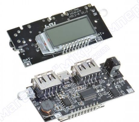 Модуль PowerBank использует Li-Ion аккумулятора 1S (3.6 В) с ЖК дисплеем. Технология Dual-USB позволяет подключать к usb-портам сразу два устройства и заряжать их одновременно. ЖК-дисплей с подсветкой отображает информацию о подключенном устройстве, оставшемся заряде, рабочем напряжении. Для активации модуля используется кнопка на боковой панели платы.